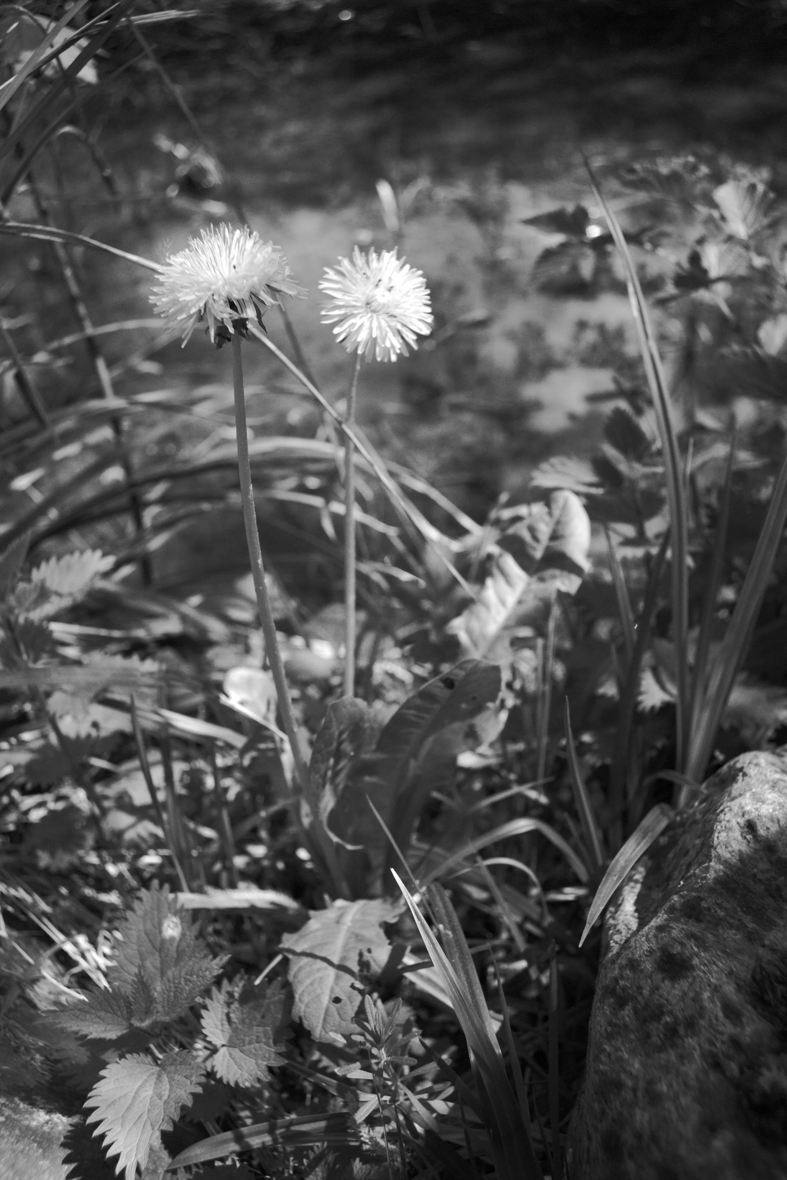 Ein Stück weiter, am Rand des Pfades, blüht ein Löwenzahn in voller Pracht. Zwei leuchtende Sonnenräder ragen aus dem wilden Grün empor – Taraxacum officinale, einfach, unscheinbar, aber voller Leben. Ein stiller Frühlingsgruß aus dem Boden, begleitet von Brennnesseln, wilden Erdbeeren und Lichtflecken, die durch das Blattwerk tanzen.